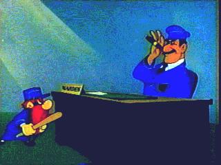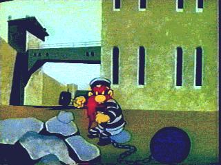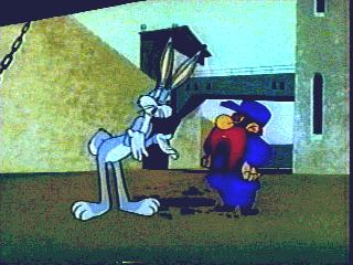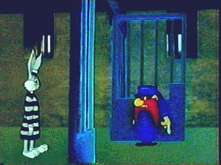 Bugs hops in a rabbit hole and comes up in Sing Song Prison. Mistaken